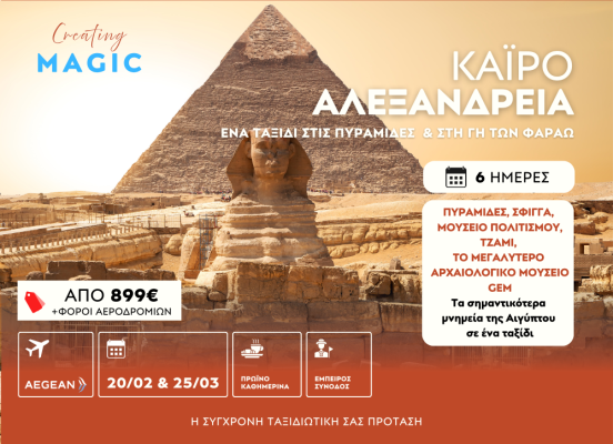 Ζήστε ένα αξέχαστο ταξίδι στην καρδιά της Αιγύπτου, εκεί όπου η ιστορία ζωντανεύει μέσα από τα θαύματα των Πυραμίδων, την κοσμοπολίτικη Αλεξάνδρεια και τη γοητεία του Καΐρου. Ανακαλύψτε το νέο Μεγάλο Αιγυπτιακό Μουσείο (GEM), τα παζάρια και τις γειτονιές που μυρίζουν Ανατολή, και αφήστε το μεγαλείο των Φαραώ να σας ταξιδέψει πίσω στον χρόνο. Μια εμπειρία γεμάτη πολιτισμό, ιστορία και εικόνες που μένουν αξέχαστες. Πλήρες οργανωμένο πρόγραμμα με διαμονή σε πολυτελές 5* ξενοδοχείο και έμπειρο αρχηγό.